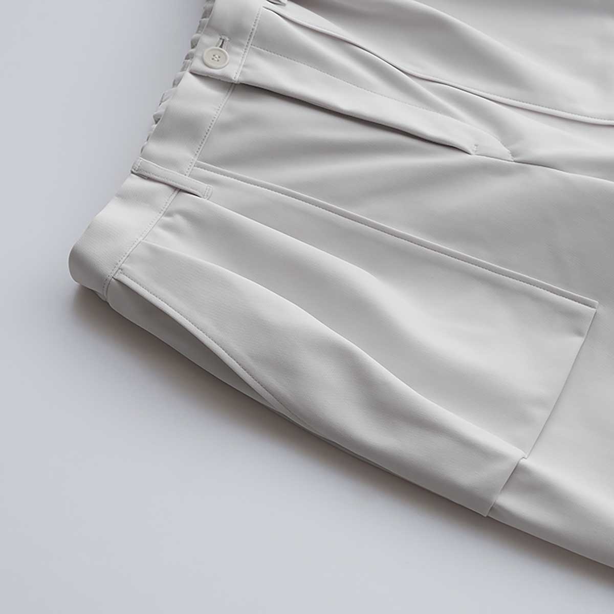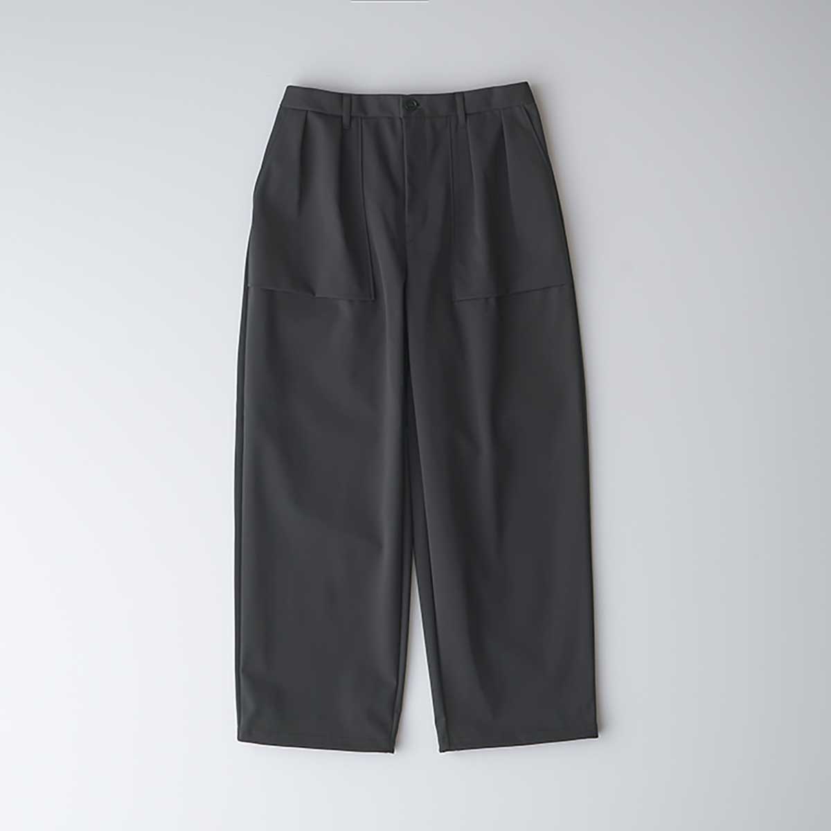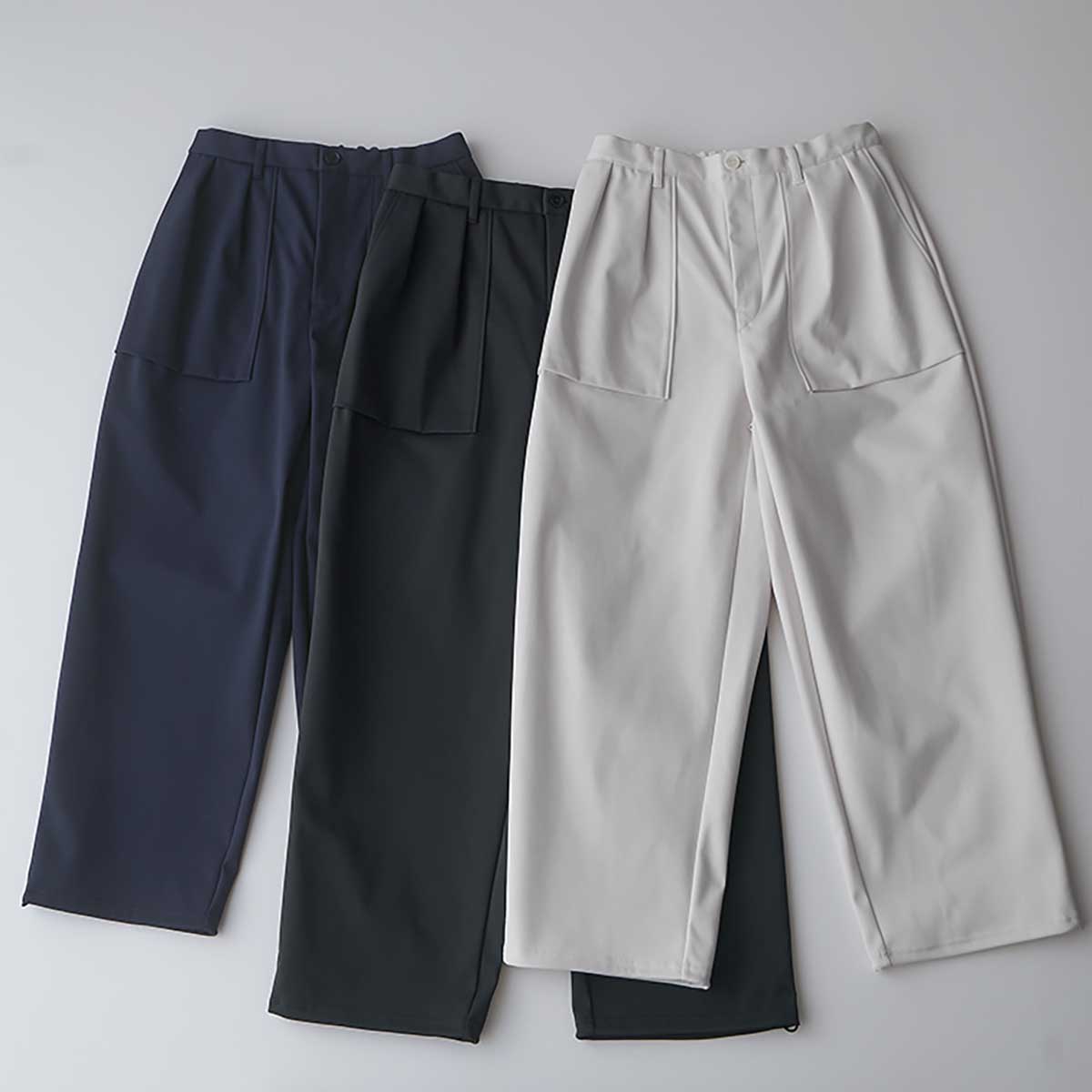 A wide pants made from TEXBRID® knitted fabric with a high gauge. Despite being lightweight and having excellent elasticity, it features a shape memory-like firmness and stiffness, which gives a well-defined silhouette.