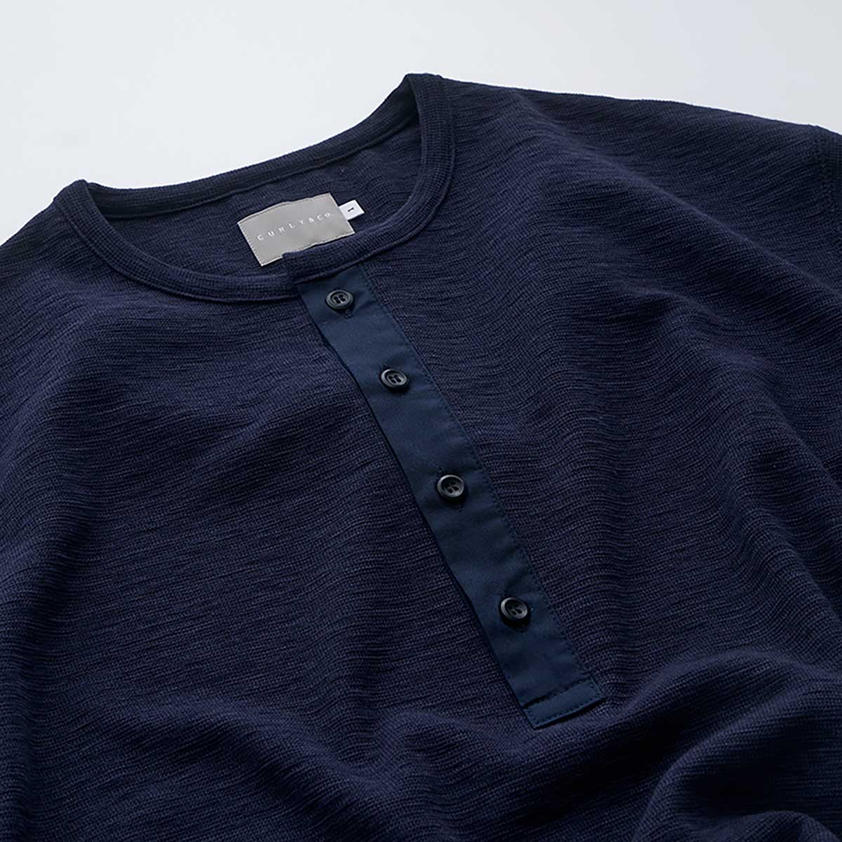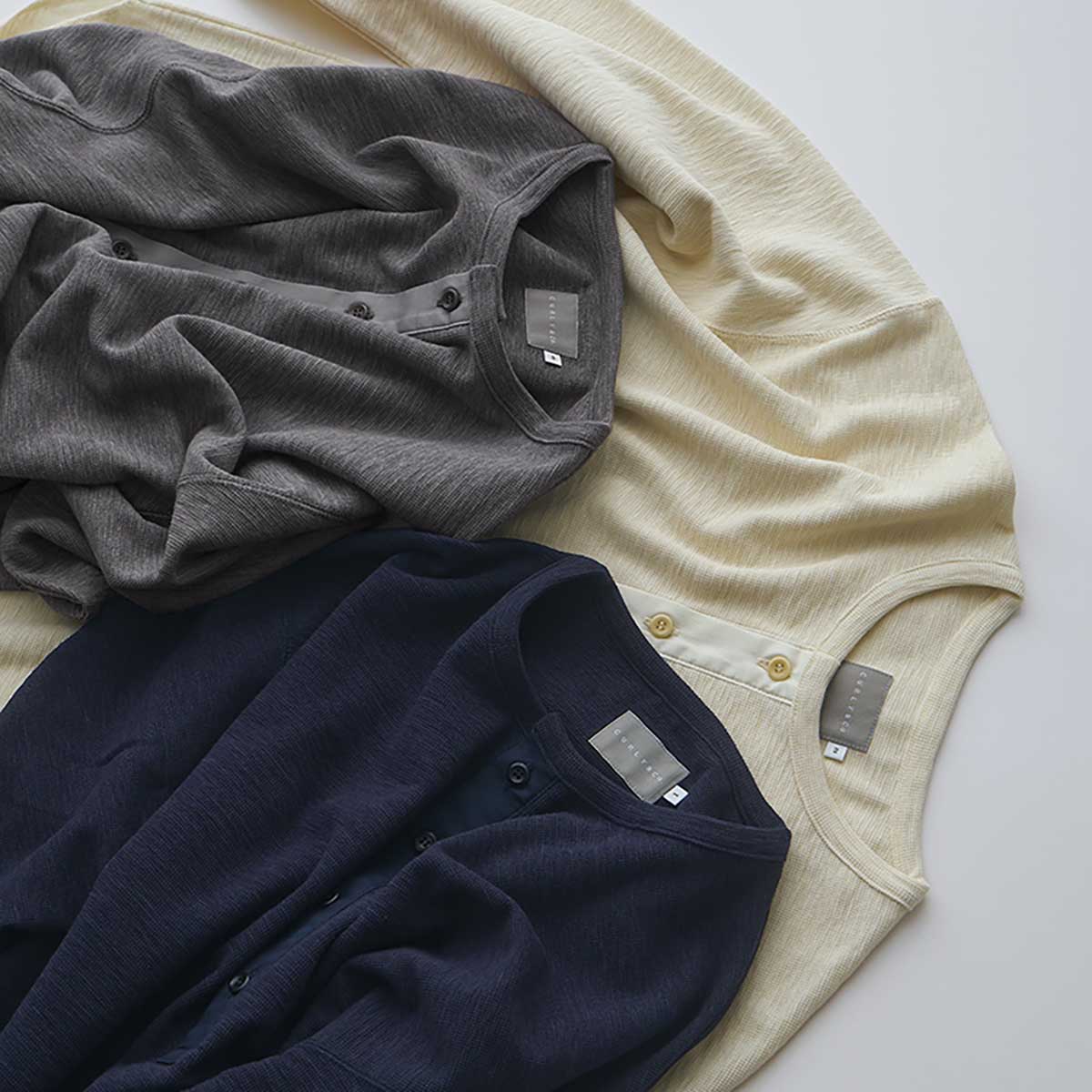 A henley neck T-shirt made from organic cotton surf knit.In addition, the fabric has a sense of fullness and suppleness, making it feel comfortable against the skin from the very beginning.