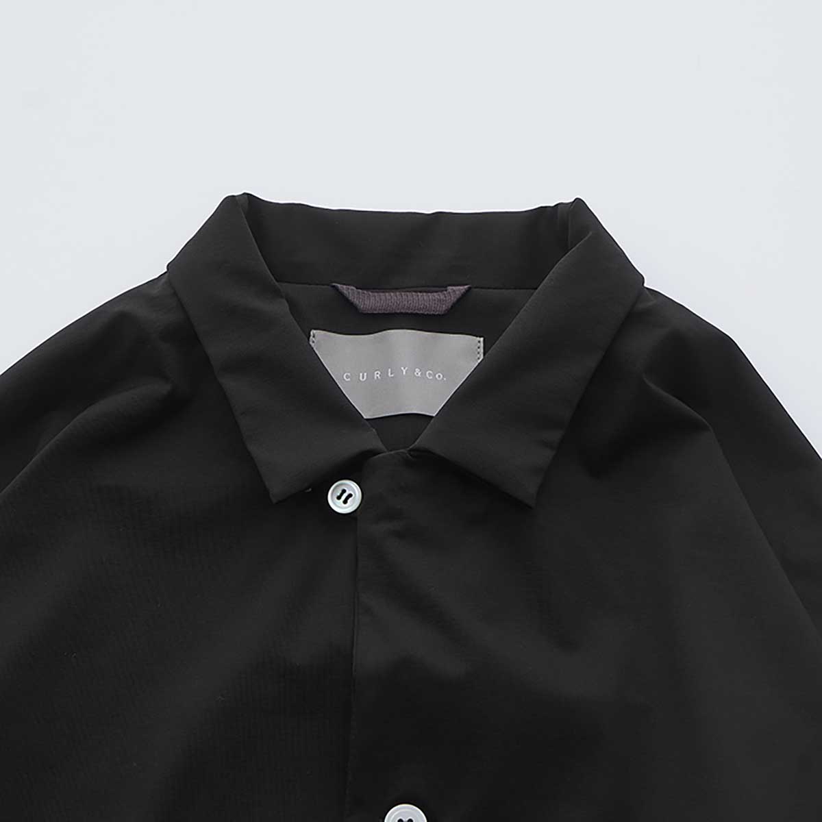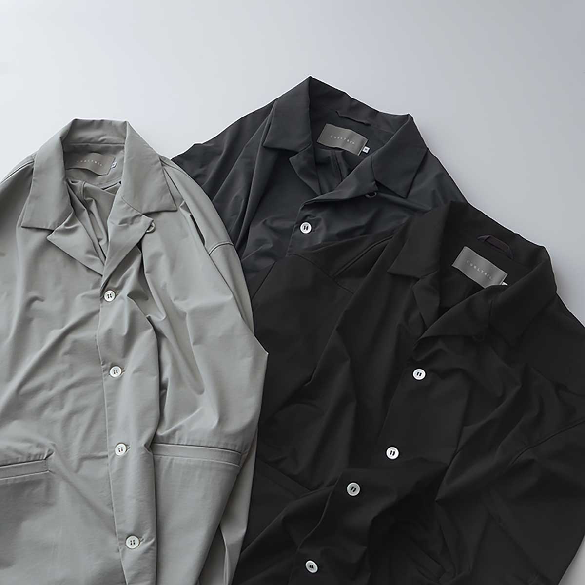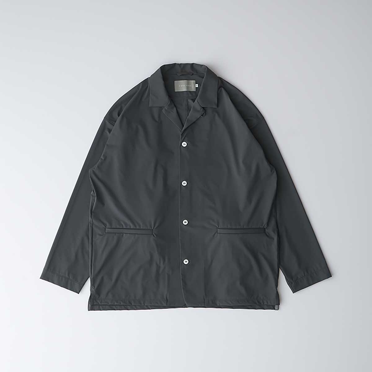 A shirt jacket made from stretch nylon tricot material.It is resistant to wrinkles and has a contact cool feeling feature, making it convenient for environments with temperature differences.The design is a hybrid of shirt and jacket elements.